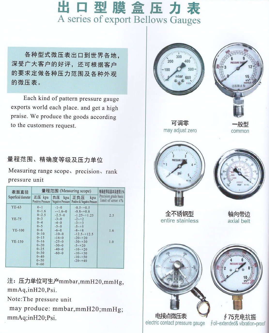 【简述】:各种型式微压表出口到世界各地,深受广大客户的好评,还可以根据客户的要求定做各种压力范围及各种外观的微压表。